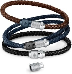 Las pulseras Maserati de cuero aportan calidez y carácter. El cuero ofrece una sensación más cercana y natural, ideal para quienes prefieren un estilo relajado pero cuidado. Son pulseras que encajan muy bien tanto en looks casuales como en combinaciones más elegantes.